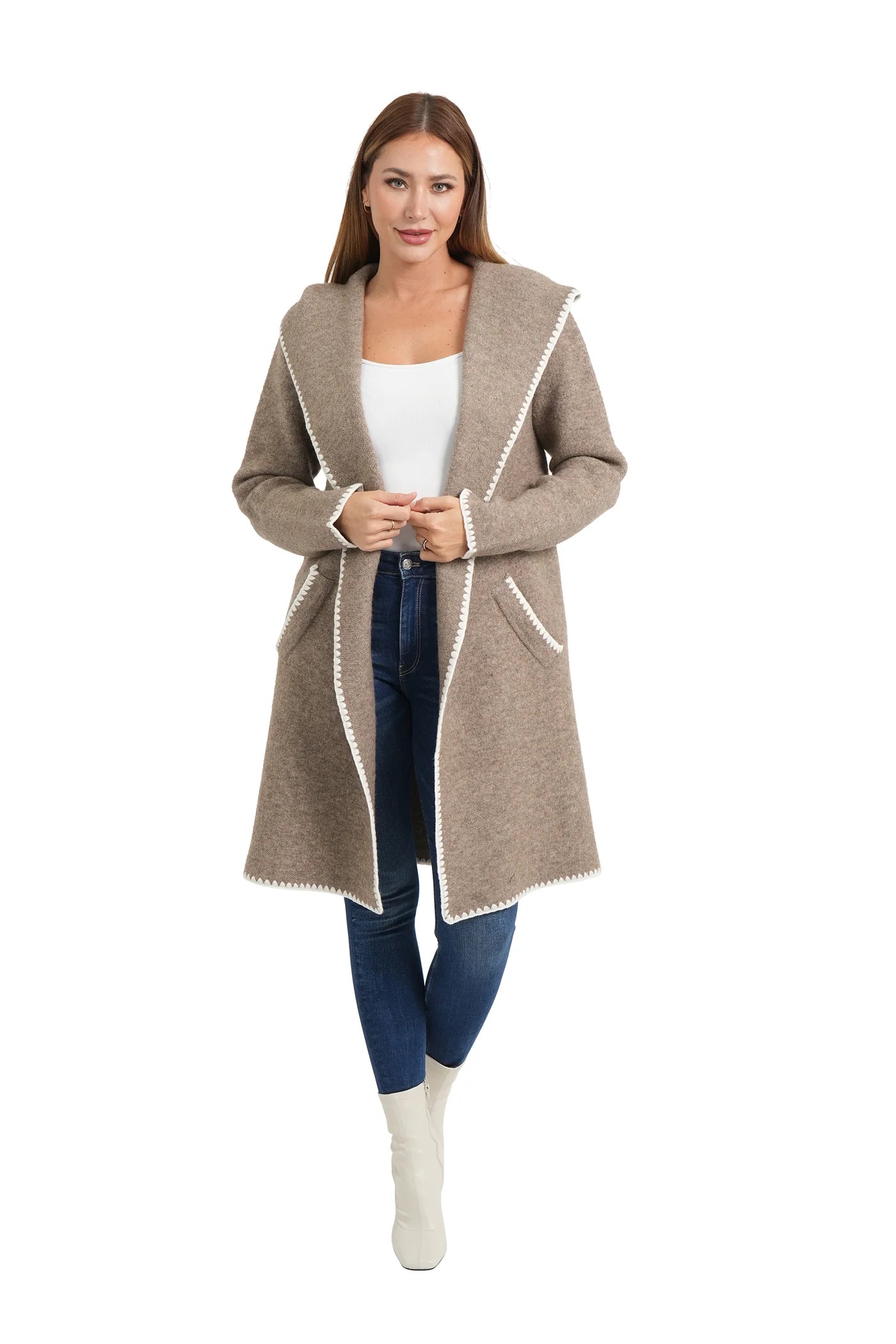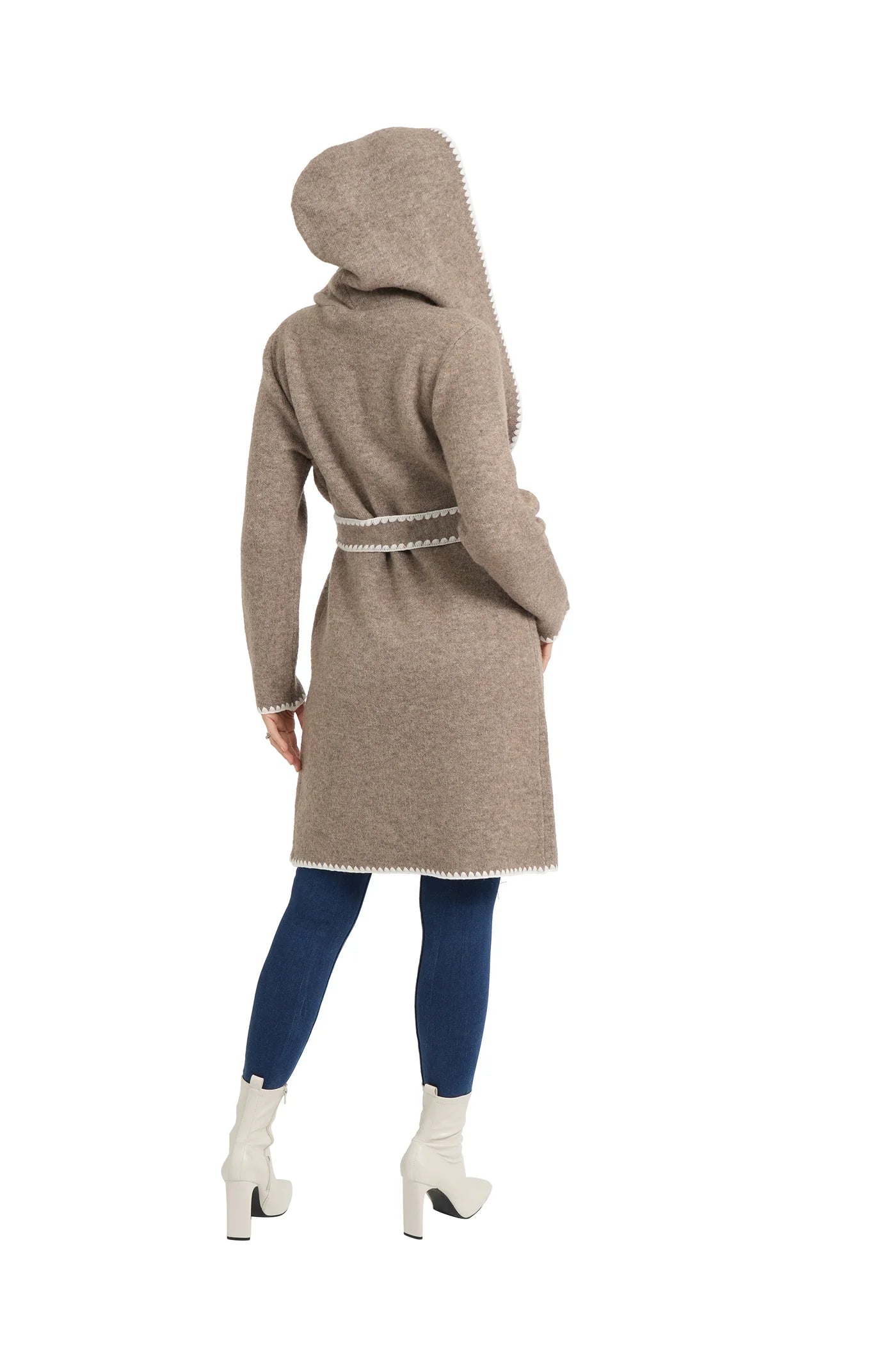 Dale wrap cardigan with embroidery, shawl collar, open front, front welp pockets, wrap belt, embroidery detail, relaxed fit.